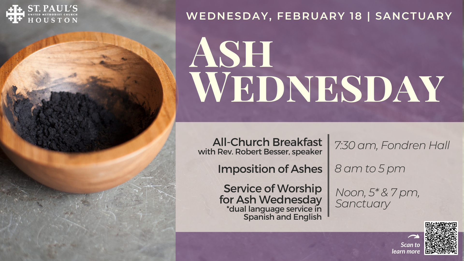 Ash Wednesday, February 18, begins with the Men’s Bible Study annual Ash Wednesday breakfast. Rev. Robert Besser, who serves as the Treasurer and Director of the Center of Connectional Resources for the Texas Annual Conference, will be the guest speaker. Everyone is welcome to this free breakfast at 7:30 am in Fondren Hall. Donations are welcome to defray the cost of the meal. Ash Wednesday will also feature three services, at noon, 5 pm (Spanish and English) and 7 pm, all with the imposition of ashes. Unable to attend one of those services? Our clergy will be available that day, just stop by the church.